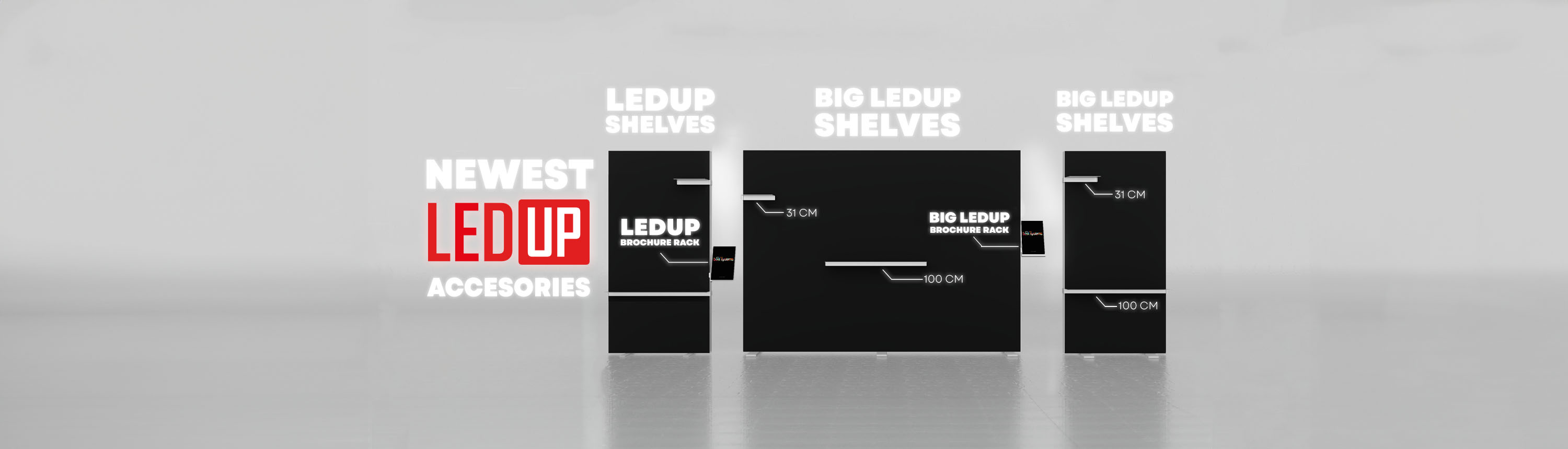 Unsere neuesten Innovationen – die Brochureholder und Shelves für BIG LEDUP®! Diese Produkte sind so konzipiert, dass die Präsentation von Broschüren und Produkten einfacher denn je wird. Der Prospektständer ermöglicht eine elegante Präsentation von Broschüren neben Ihren Systemen, während das BIG LEDUP® Shelf in zwei Breiten erhältlich ist: 31 cm und 100 cm.